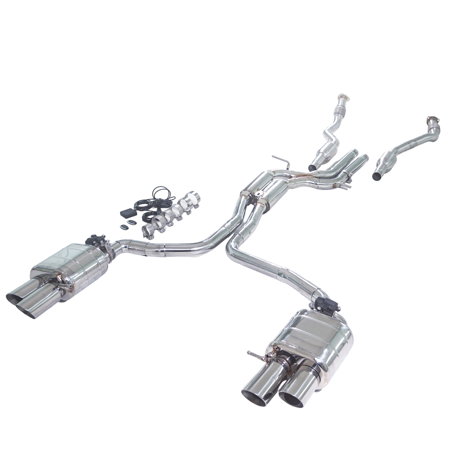 Take your S4 B8 3.0T to the next level with the GFC Full Exhaust System — a complete turbo-back upgrade that replaces the front (with catalytic), mid, and rear sections for maximum flow, deeper tone, and a more commanding presence. Dual electronic valves give you full control over your sound: